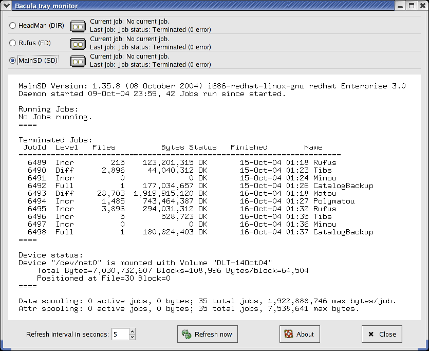 The Monitor program is typically an icon in the system tray. However, once the icon is expanded into a full window, the administrator or user can obtain status information about the Director or the backup status on the local workstation or any other Bacula daemon that is configured.